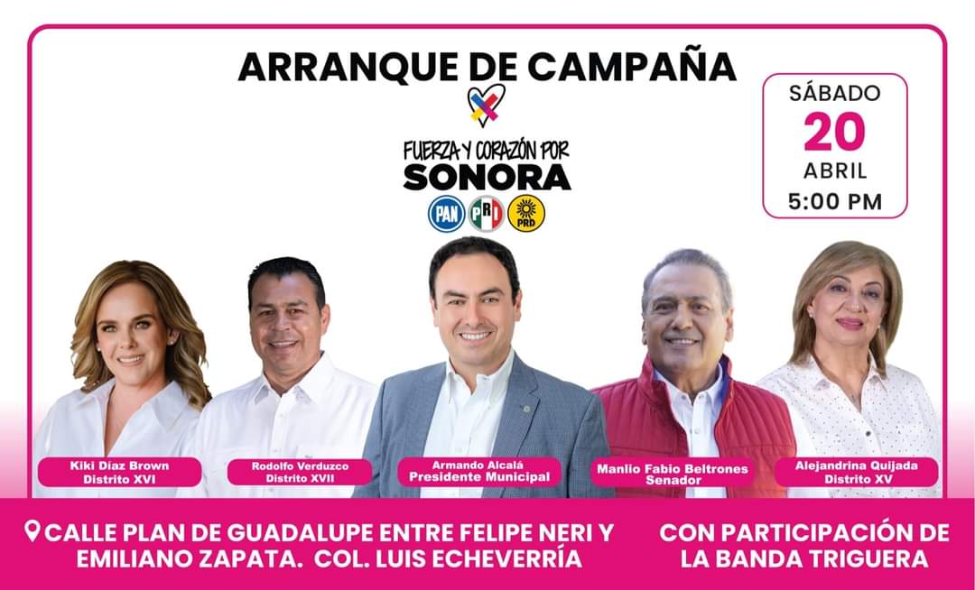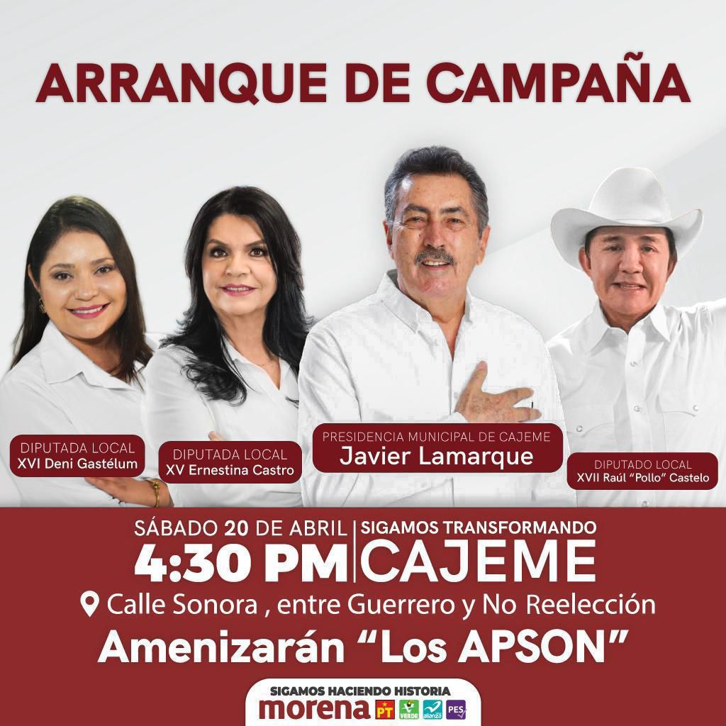 Ciudad Obregón, Sonora; abril de 2024.- Este sábado 20 de abril en distintos puntos de la ciudad los diversos candidatos a elección popular estarán llevando a cabo sus arranques de inicio de campañas políticas, esto con miras a ser electos por los cajemenses el próximo 02 de junio.