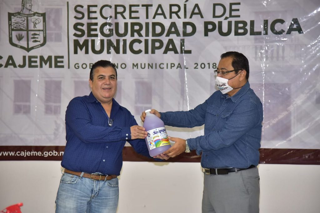 Ciudad Obregón, Sonora, mayo del 2020.- Con la intención de reducir la posibilidad de contagios de Covid-19 a través del programa «Más Unidos que Nunca», mismo que impulsa el Alcalde Sergio Pablo Mariscal Alvarado, la empresa Arquim se sumó con la donación de 20 garrafones de 20 litros cada uno con producto sanitizante virucida y 200 unidades en presentación de litro, además, de 200 litros de gel antibacterial y 50 galones de jabón para manos, el cual será utilizado por el personal operativo de la Secretaría de Seguridad Pública Municipal.