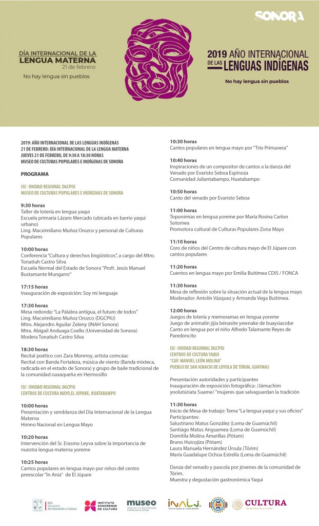 Hermosillo, Sonora, febrero de 2019.- En el marco de Año Internacional de las Lenguas Indígenas, este 21 de febrero Sonora celebrará el Día Internacional de la Lengua Materna en centros culturales de Hermosillo, Ciudad Obregón, Huatabampo y Guaymas.