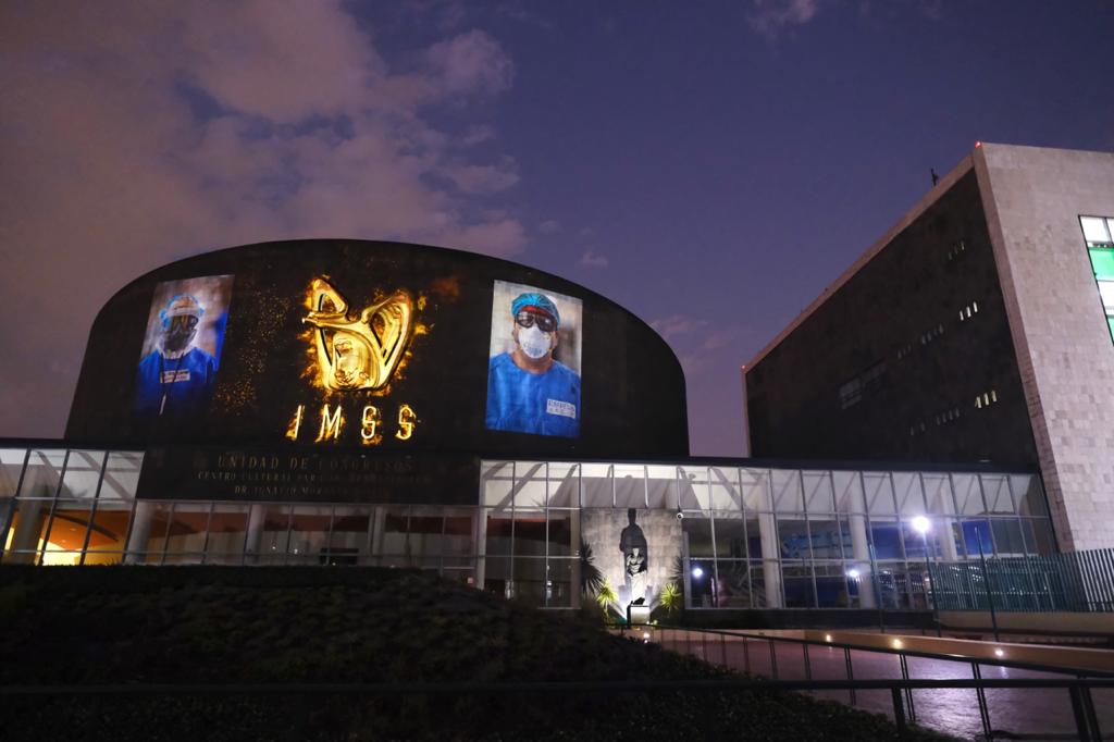 Ciudad de México, mayo del 2020.- Porque no hay aplausos suficientes que reconozcan la destacada labor del personal de salud del Instituto Mexicano del Seguro Social (IMSS), desde hace dos semanas y hasta el 14 de junio, en la fachada de la Unidad de Congresos del Centro Médico Nacional (CMN) Siglo XXI se proyectan más de 100 imágenes de los héroes que están en la línea de batalla por preservar la vida de los pacientes con COVID-19.